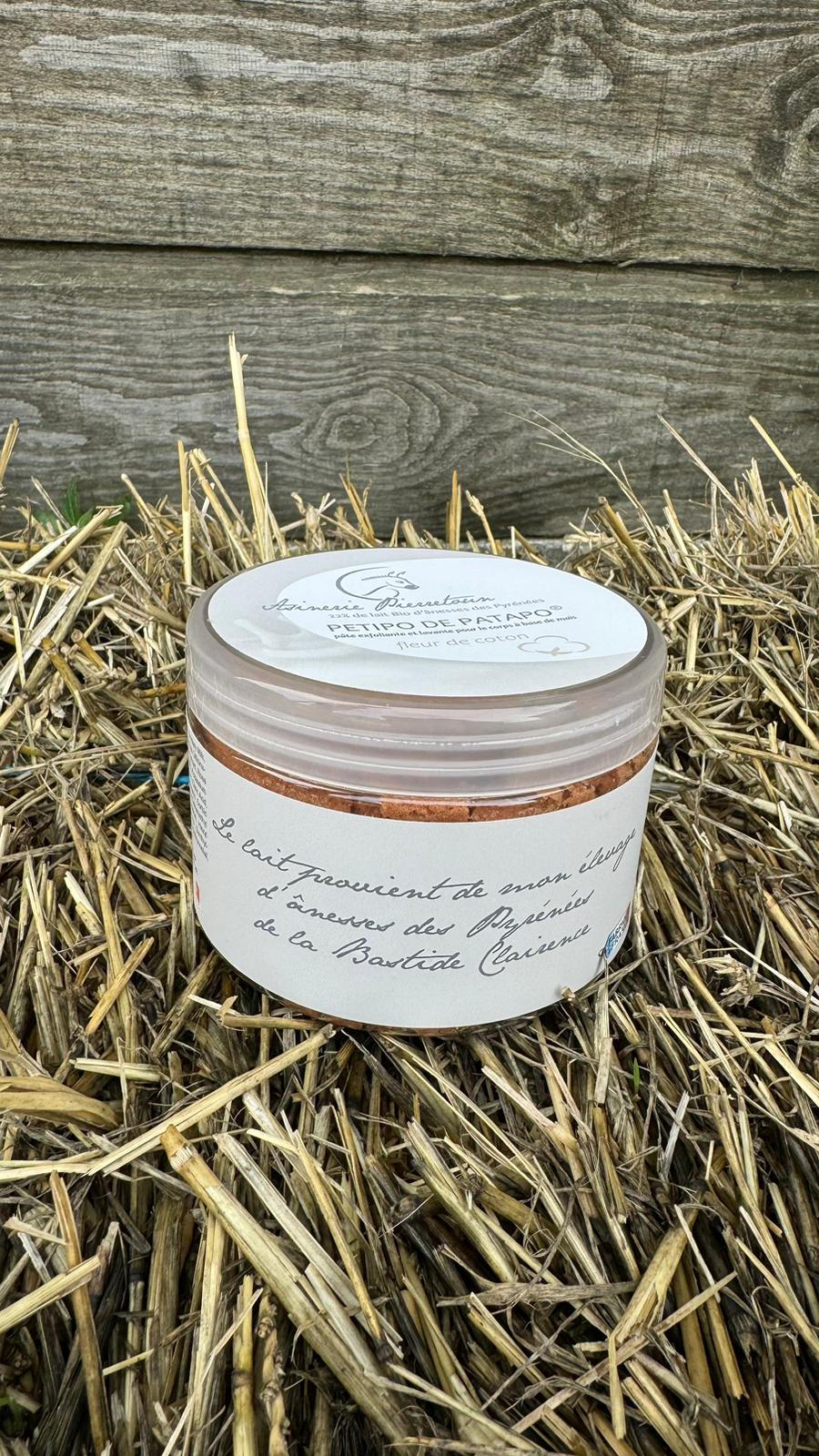 Le Petipo de Patato, une pâte exfoliante composée de rafles de maïs associée à notre base lavante naturelle et à 22% de lait d'ânesse bio.